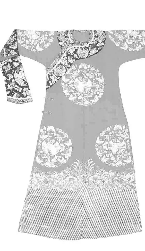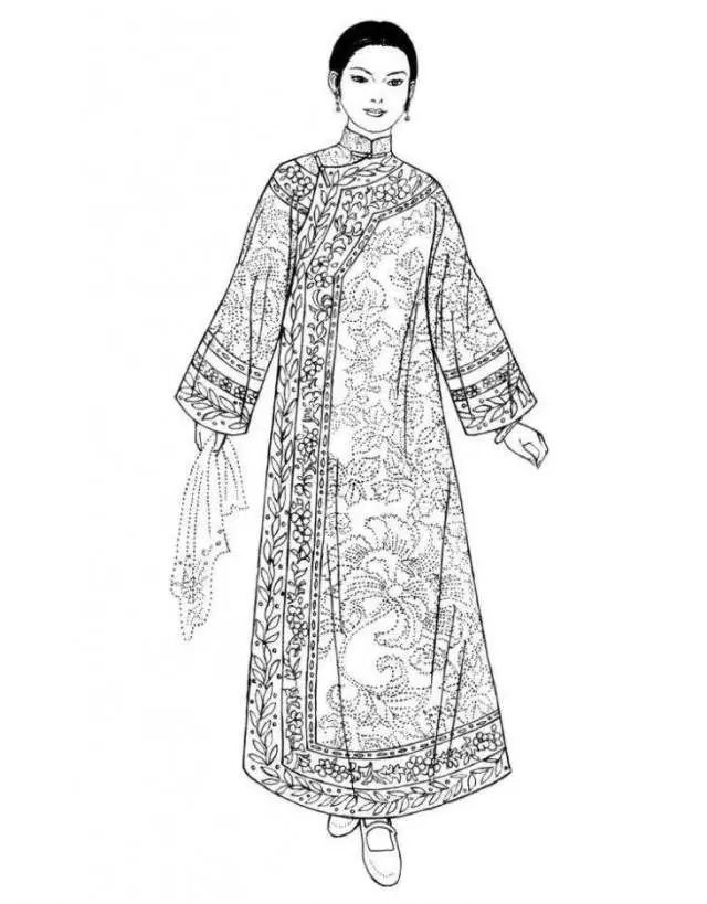 清朝后期,旗女(滿洲女子)所穿的長(zhǎng)袍,衣身較為寬博,造型線條平直硬朗,衣長(zhǎng)至腳踝?!霸獙氼I(lǐng)”用得十分普遍,領(lǐng)高蓋住腮碰到耳,袍身上多繡以各色花紋,領(lǐng)、袖、襟、裾都有多重寬闊的滾邊。同治年間,鑲、滾技藝達(dá)到高峰時(shí)期,有的甚至整件袍服全用刺繡、花邊鑲滾,幾乎難以辨認(rèn)原本的衣料。旗女袍服的裝飾繁瑣至登峰造極的程度,從另一個(gè)方面也凸顯了強(qiáng)權(quán)霸主的欲望。